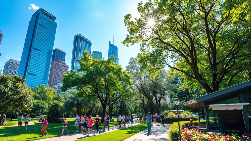 They also foster community engagement, inviting you to join local events or meet neighbors. By providing a sanctuary for relaxation and recreation, urban green areas not only improve your mental well-being but also create a sense of belonging, making city living more enjoyable and fulfilling.